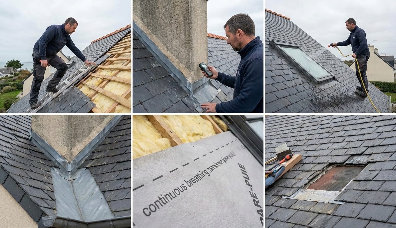 Vérifier l’étanchéité arrête durablement infiltrations d’eau et d’air autour des percements sensibles. Ainsi, on contrôle cheminées, fenêtres de toit, noues, faîtages et relevés de zinguerie. Le pare-pluie doit rester continu, respirant et parfaitement jointoyé aux éléments verticaux. Par conséquent, une fuite repérée s’isole d’abord et se répare avant toute pose d’isolant.