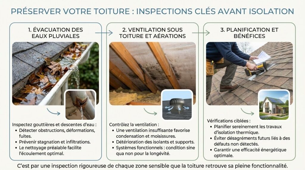 Une bonne évacuation des eaux pluviales et une ventilation efficace sont indispensables pour préserver la toiture. Inspectez les gouttières et descentes d’eau pour détecter obstructions, déformations ou fuites pouvant engendrer stagnation et infiltrations. Le nettoyage préalable à l’isolation facilite ainsi un écoulement optimal.